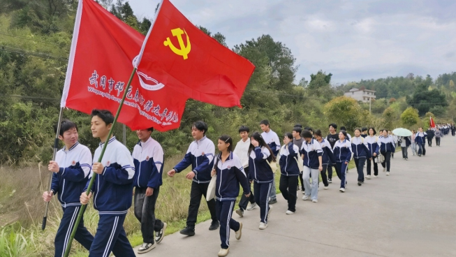中午12时,身着校服、佩戴团徽的学子们整齐列队,在校长的带领下踏上征程。鲜红的党旗与校旗在前引路,队伍沿着乡间道路有序前行,成为春日田野里一道亮丽的风景线。行进途中,学生们相互鼓劲,“加油!坚持住!”的呐喊此起彼伏,为漫长的徒步增添温暖与力量。老师们全程细心关照,不时询问学生身体状况,为体力稍弱的孩子提供帮助,用行动诠释着责任与关怀 。