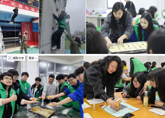 体能与传统技艺课堂上,高空攀岩、高空速降项目中,同学们直面挑战、突破自我,磨砺迎难而上、永不言弃的坚韧品格;花式面点制作里,大家揉面塑形、亲手蒸制,在指尖劳作中感受劳动之美与淮扬美食文化底蕴;书法拓印课堂上,学子蘸墨铺纸、细心敲拓,在一 笔一印间触摸非遗文脉,感悟中华优秀传统文化的深厚魅力。