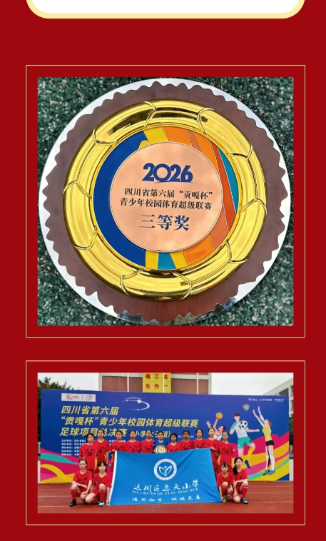 本网四川达州讯(杜靖宇 观理 报道)春风送暖,绿茵燃情!近日,四川省第六届“贡嘎杯”青少年校园足球总决赛(小学女子组)落下帷幕。达川区逸夫小学女子足球队凭借扎实的功底、顽强的斗志荣获三等奖。这也是该校女足连续六年代表全市征战省“贡嘎杯”青少年校园足球赛,同时是学校历史上第二次闯入“贡嘎杯”总决赛。