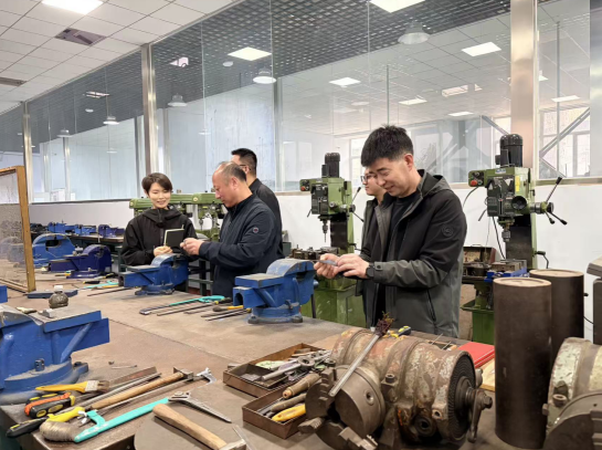 一行人实地参观了学校实训车间和教学展示区,北方机电工业学校教师现场介绍了实训设备操作流程、专业教学开展情况及技能人才培养等方面的成果。