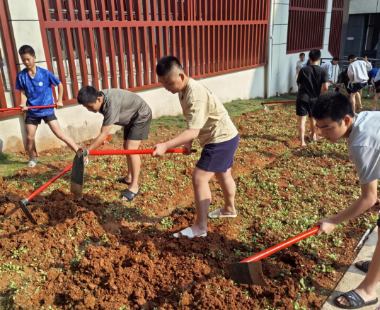 本网江西讯(李才莲)为落实劳动教育要求,推进“五育并举”,近日,江西吉安市阳光学校组织各班学生,在班主任、教官及任课老师的全程陪同下,走进校园劳动实践基地,开展锄地翻耕劳动实践。