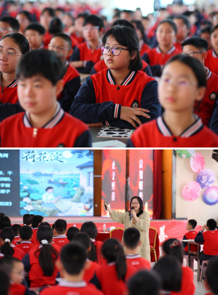 活动中,息玲玲以本土作家孙犁的《荷花淀》与著名作家迟子建的《额尔古纳河右岸》两部经典作品为范本,为在场师生呈现了一堂“中国式美学”阅读写作课。她巧妙设计了“初见”“入境”“入心”等环节,首先通过地图与风景图片的对比展示,引导学生用诗意的文字表达出对两地的初印象,然后以沉浸式朗读的方式体会孙犁笔下诗意小说的独特韵味,再聚焦《额尔古纳河右岸》,用演绎的方式带领学生进入小说的叙事世界,最后,组织“双营记写作工坊”将活动推向高潮,让学生在“微写作”中练习技法,完成从“读者”到“小小创作者”的蜕变。