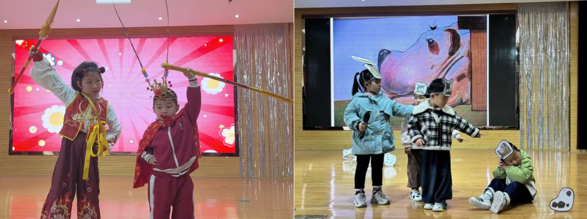 各班绘本分享会温情启幕,孩子们在生动的故事里感受文字魅力、体悟成长道理。世界读书日当天,绘本童话剧展演将活动推向高潮,大班《拔苗助长》、中班《彩虹色的花》、小班《是谁嗯嗯在我的头上》轮番精彩上演,孩子们用童真童趣的演绎,让静态绘本化作鲜活舞台故事,尽显灵动与自信。随后的绘本角色扮演秀上,孩子们化身书中角色,沉浸式体验阅读乐趣,成为校园里一道鲜活亮丽的风景线。