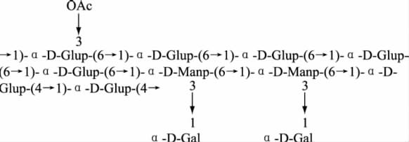 学者王世林等从铁皮石斛中分离纯化得到3 种多糖,确定它们为一类O-乙酰葡萄甘露聚糖,由几个 p- (1—3)-甘露吡喃糖基和一个p-(1 —4) -D-吡 喃糖基重复构成主链,支链可能由 p-( 1—4) -葡萄 糖基和其他戊糖基组成,并连接在上链葡萄糖基的3 或 6 位 。